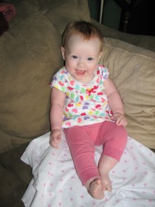 Another change is that I’m trying to teach her – or get her to learn since I don’t know how much active teaching I’m doing in this regard – how to fall asleep on her own. When she was a newborn, I certainly didn’t expect her to know how to fall asleep on her own except when she did so by accident, so I would rock her and rock her and rock her some more until I felt relatively certain that she was asleep. More often than not, during those first few weeks, her eyes would spring open and a wail would come flying forth from her mouth the second I eased her onto the mattress. I carried that habit of rocking her to sleep forward; most of the time it wasn’t a big deal because she would be half-asleep by the time she finished her bottle so it would only take a few extra minutes of rocking her in her room before I could sneak out.