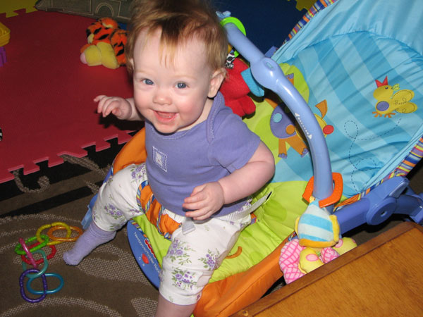 This was taken yesterday. Claire dropped some of her toys on the floor, and was then trying to move out of the chair to get them. Thank goodness she was strapped in!