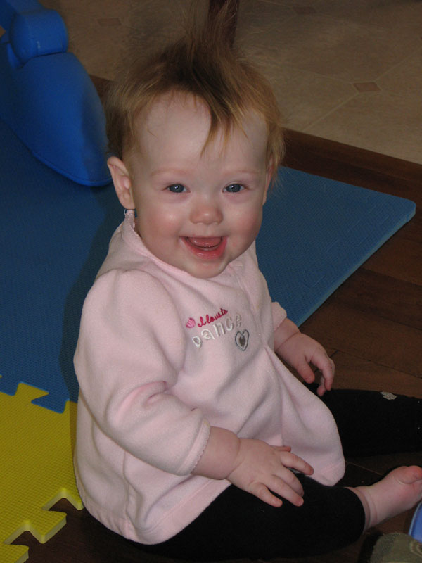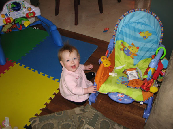 * Her mats are close to her vibrating chair, and she loves to crawl over and use it to pull herself up to look inside it, such as she is doing now as I type this.