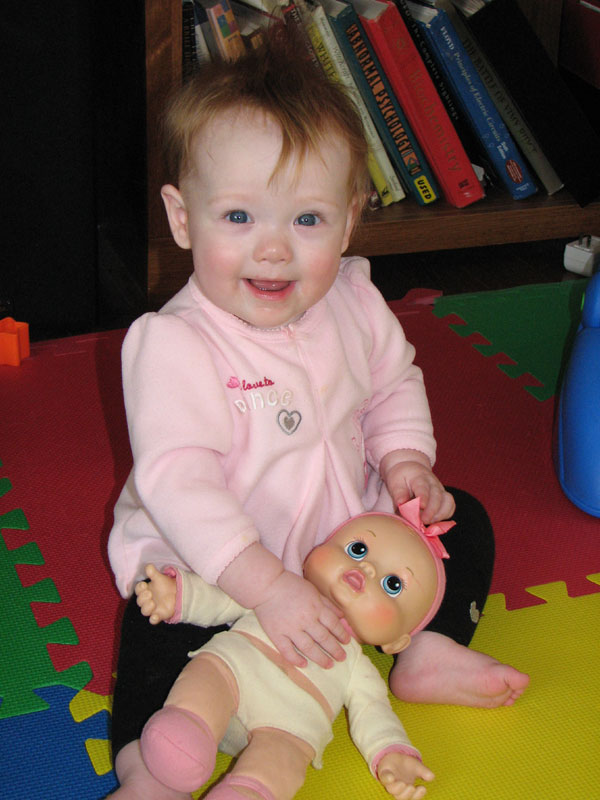 * She plays her own version of peek-a-boo. For awhile now, when playing, Neal or I would drop a receiving blanket or her blanket bunny on her head, and she’d yank it off and laugh. Or we’d put it on our own heads for her to yank off. Now, without prompting or reminding from us, she will grab the receiving blanket, and hold it in front of her face, then quickly drop it, smiling at our sounds of amazement and laughter.