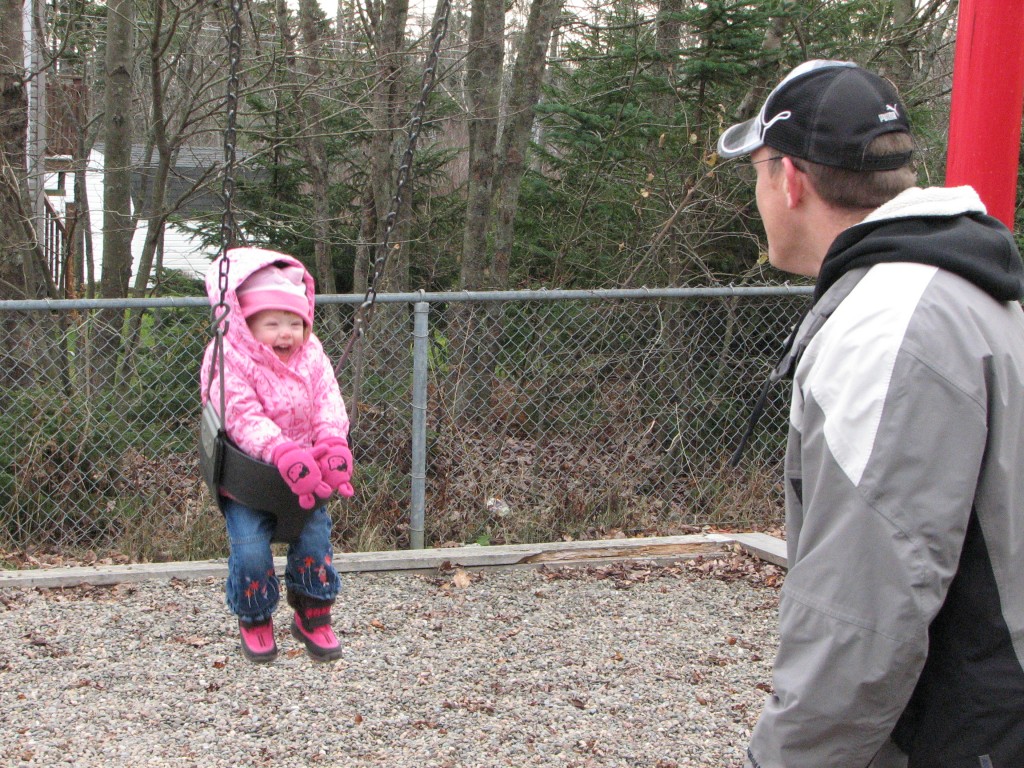 It was supposed to get a lot warmer today, but obviously that did not include this morning. The thermometer on the back read 4 degrees Celsisus (39.2 degrees fahrenheit), but it felt much colder than that. The wind was cold and damp, and I was thankful for my hat and gloves when the three of us went for a walk. We checked out a nearby lake that usually has a bunch of ducks, but I guess the cold weather lately drove them away, so we headed to the park instead where Claire had a blast going down the slide and being pushed on the swing.