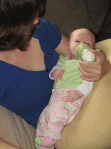 * We’re trying to figure out what kind of formula is best for her. In the hospital, she was on Similac. Then we put her on Good Start at home since that’s what we happened to have. It seemed to make her gassy so we switched back to Similac. A few days later, I noticed that her poop started to get runny and I worried that she was having diarrhea and might get dehydrated. We took her to the duty doctor who checked her over and determined she was doing well and to keep an eye on her – as long as she still has wet diapers and tears when she cries, then she’s not dehydrated. Still, we worried, and at her one-month appointment, our doctor – who didn’t seem overly concerned about her poop – said that we might as well switch back to Good Start, but didn’t appear to think that it would make a huge difference either way. So we put her back on Good Start. Almost immediately, her poop stopped (as had happened when we had her on it before) and she started getting fussier. So now we’re back on Similac and we’re going to see what happens. I will be very happy when we figure out what damn formula is good for her!