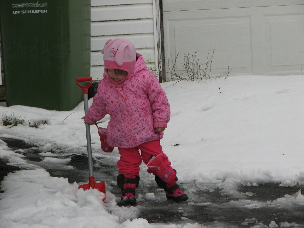 It was enough of a shock that she quieted down right away and after I sat her in her car seat, I was able to put her socks and shoes on, although I was not about to start fussing with her coat at that point. I got in the car, backed out onto the street and heard a forlorn “Coat? Coat!!” followed by slightly-less-hysterical crying.